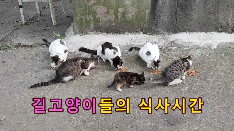 길고양이들의 식사시간이에요.