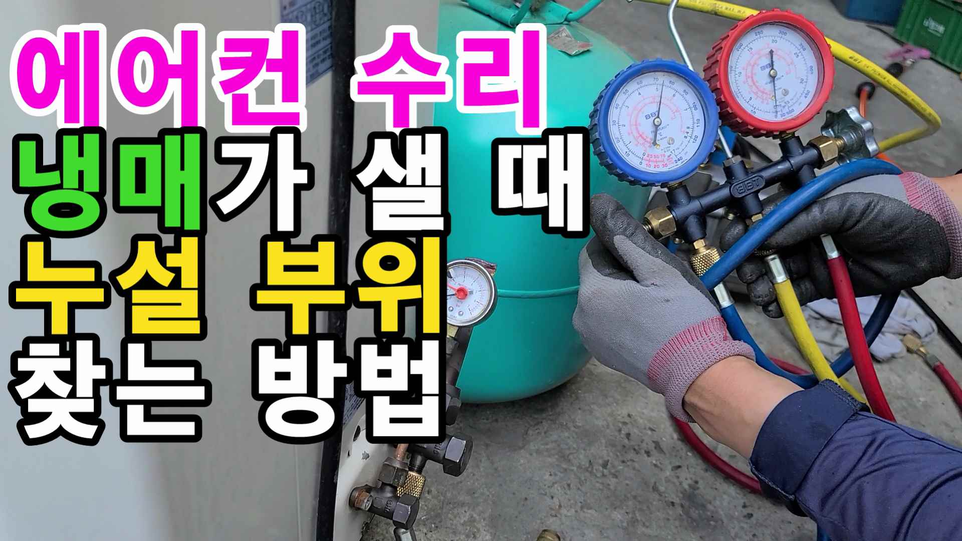 이때 질소로만 충전해서 누설 부위를 찾을 수도 있지만 만약 누설 부위 탐지가 쉽지가 않아 냉매 누설 탐지기까지 사용할 계획이라면 냉매와 질소를 함께 충전합니다.